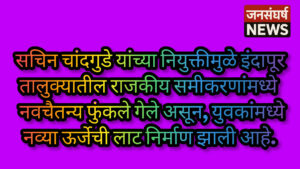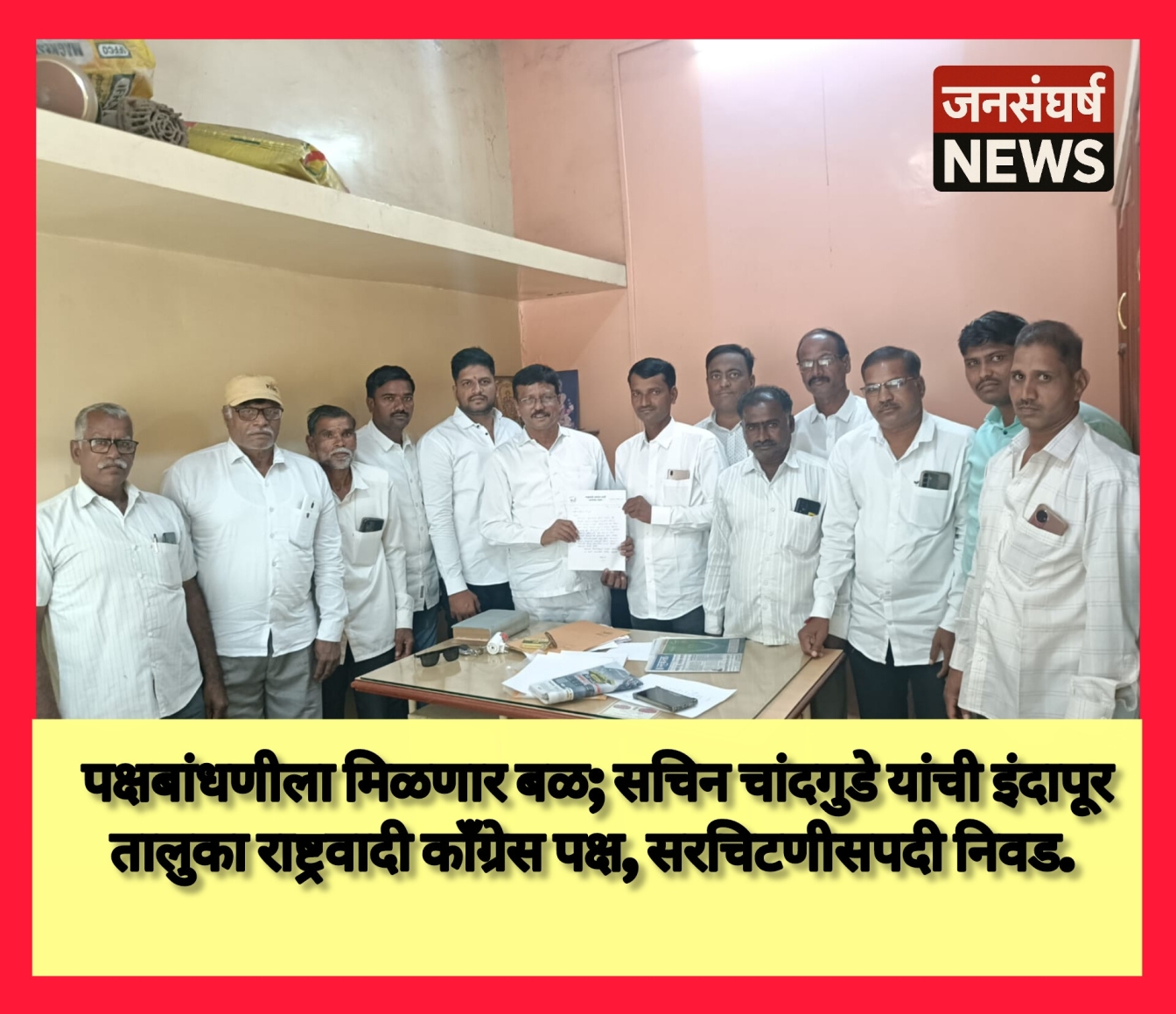 इंदापूर, ता.१४ : इंदापूर तालुक्यातील कार्यकर्त्यांचा उत्साह वाढवणारी आणि पक्ष संघटनेला नवे बळ देणारी नियुक्ती — श्री. सचिन हनुमंत चांदगुडे यांची इंदापूर तालुका राष्ट्रवादी काँग्रेस पक्ष (शरदचंद्र पवार गट) तालुका सरचिटणीसपदी निवड करण्यात आली आहे. त्यांच्या निवडीमुळे कार्यकर्त्यांमध्ये आनंदाचे वातावरण असून, राष्ट्रवादी काँग्रेसच्या तालुका संघटनेला नवे चैतन्य लाभणार आहे.