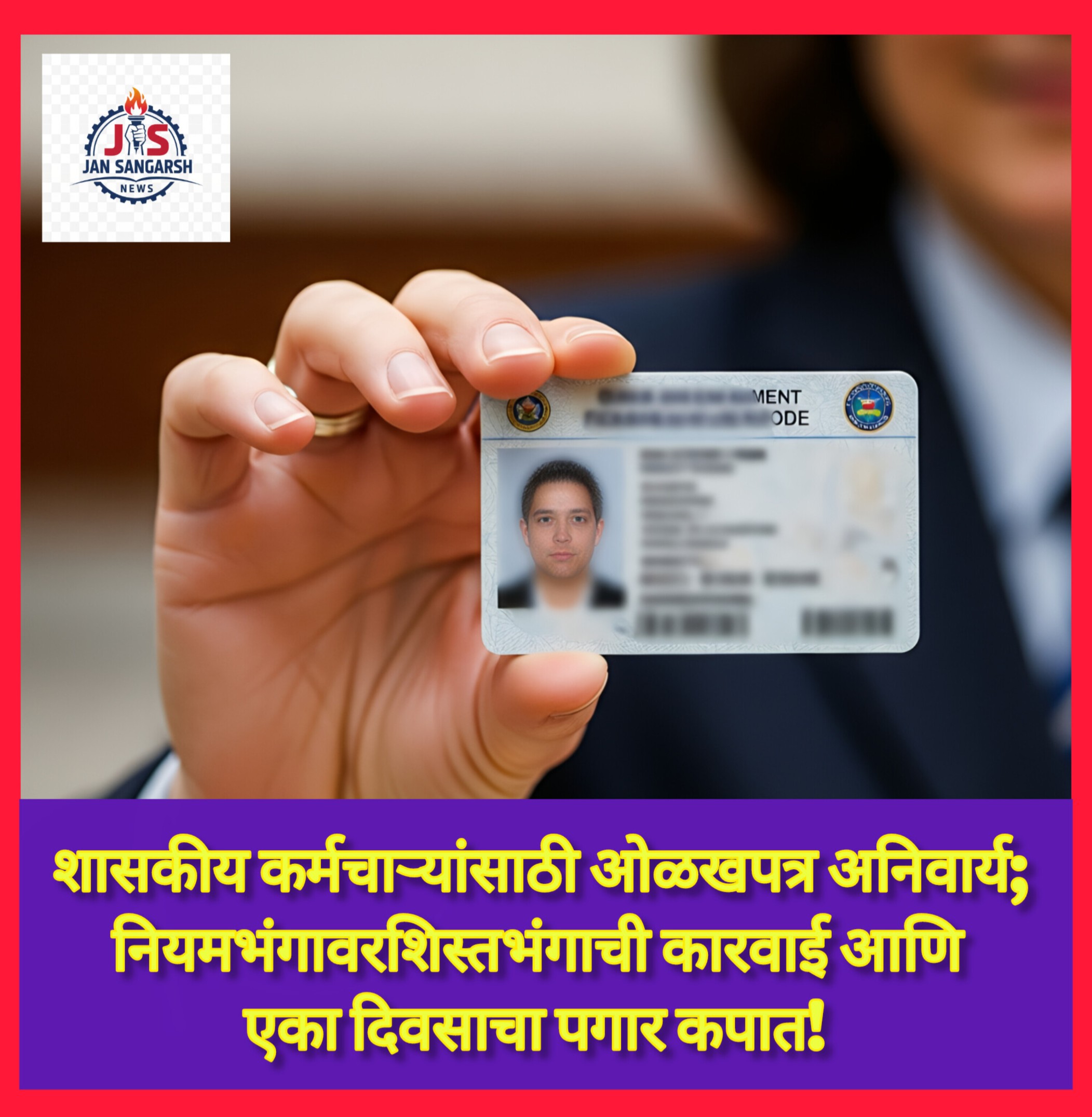 पुणे, ता.१९ :राज्यातील शासकीय कार्यालयांमध्ये नागरिकांना अधिकारी आणि कर्मचाऱ्यांची ओळख पटत नसल्याच्या तक्रारी वाढल्या आहेत. काही वेळा खासगी व्यक्ती कर्मचारी असल्याचे भासवून कार्यालयीन कामकाजात लुडबूड करत असल्याच्या घटना घडल्या आहेत. या पार्श्वभूमीवर शासनाने सर्व शासकीय अधिकारी आणि कर्मचाऱ्यांना दर्शनी भागावर ओळखपत्र (आयडी कार्ड) लावणे बंधनकारक केले आहे. हा नियम मोडणाऱ्यांवर शिस्तभंगाची कारवाई तसेच एका दिवसाचा पगार कपात करण्याचा इशारा देण्यात आला आहे.